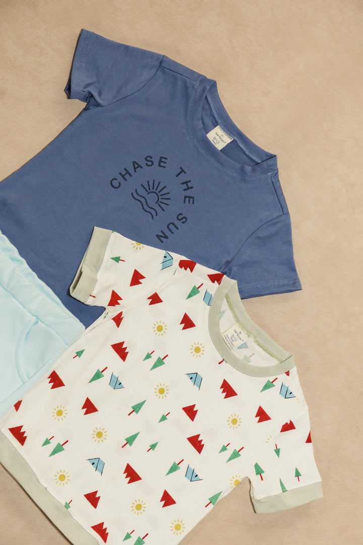REFERENCE 41911 Full-length T-shirt with Heart Stitch Embroidery. Full-length T-shirt with localized dinosaur print. Bermuda Printed light and fresh fabric with dinosaurs.